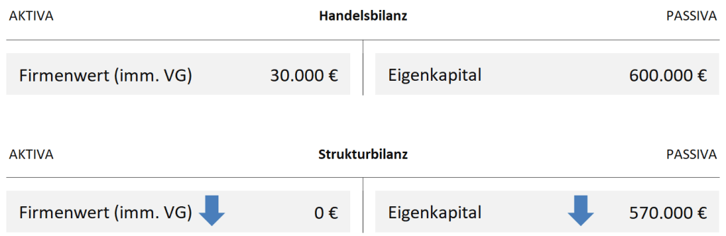 Der Firmenwert ist nicht separat veräußerbar, d. h. er ist nicht verkehrsfähig. Somit ist er tatsächlich nicht werthaltig und in der Analyse nicht zu berücksichtigen. Im Rahmen dessen ist das Eigenkapital um den Firmenwert zu verringern, so dass es nun einen Bestand von 570.000 Euro aufweist (600.000 Euro ./. 30.000 Euro = 570.000 Euro).