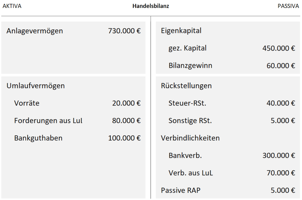 Der Bilanzgewinn (60.000 €) ist als kurzfristige Verpflichtung dem kurzfristigen Fremdkapitel zuzuordnen. Die Steuerrückstellungen werden beim mittelfristigen und beim kurzfristigen Fremdkapital mit je 20.000 Euro berücksichtigt. Sowohl die sonstigen Rückstellungen als auch die Verbindlichkeiten aus LuL werden beim kurzfristigen und die Bankverbindlichkeiten beim langfristigen Fremdkapitel eingeordnet. Die Rechnungsabgrenzungen finden ebenfalls im kurzfristigen Fremdkapital Berücksichtigung.