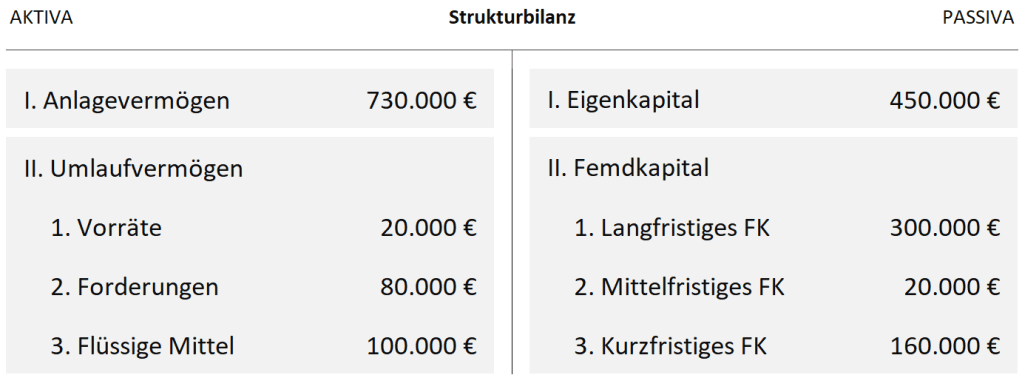 Für eine zielorientierte Analyse des Jahresabschlusses und der damit einhergehenden Aufstellung der Strukturbilanz hat sich eine Gruppierung des Kapitals der Unternehmung bewährt. Die handelsrechtlichen Bilanzposten des Eigenkapitals werden zum Eigenkapital zusammengefasst. Die Einordnung des Fremdkapitals erfolgt in langfristiges, mittelfristiges und kurzfristiges Fremdkapital.