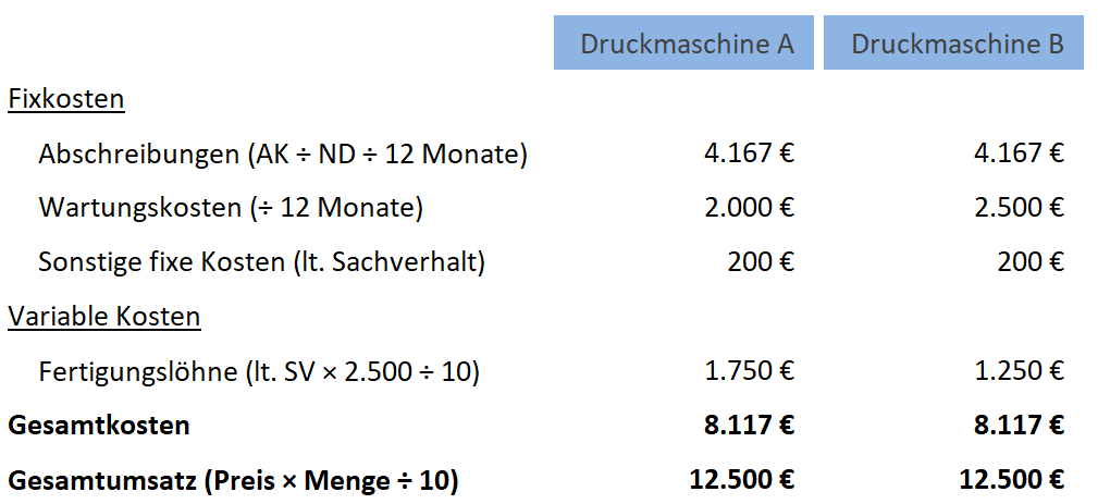 Im vorliegenden Beispiel bedarf es der Umrechnung der gegebenen Werte auf einen Monat (Betrachtungsperiode). Im Falle einer niedrigeren Absatzhöhe gemäß Aufgabenstellung im Vergleich zur Produktionskapazität der Anlage (hier bei Druckmaschine B der Fall) muss auf die Absatzmenge als Produktions- und Verkaufsmenge abgestellt werden. Im Übrigen ist zu beachten, dass die Fertigungslöhne und der Verkaufspreis „je 10 Stück“ ausgewiesen sind, was es bei der Berechnung zu beachten gilt.