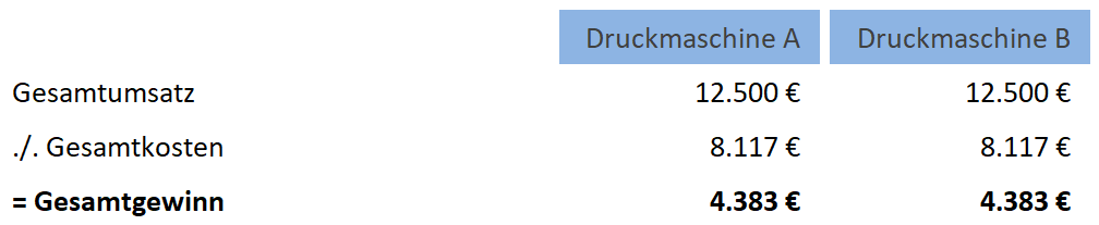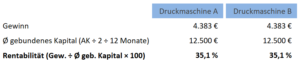 Die Druckmaschinen weisen eine gleich hohe Rentabilität von 35,1 % auf. Es sollte sich jedoch für Maschine A entschieden werden, obwohl bei ihr die höheren variablen Kosten – bei gleichen Fixkosten wie Maschine B – je Stück anfallen. Bei etwaig geringerer Auslastung mindert sich die Rentabilität dadurch weniger als bei Maschine B.